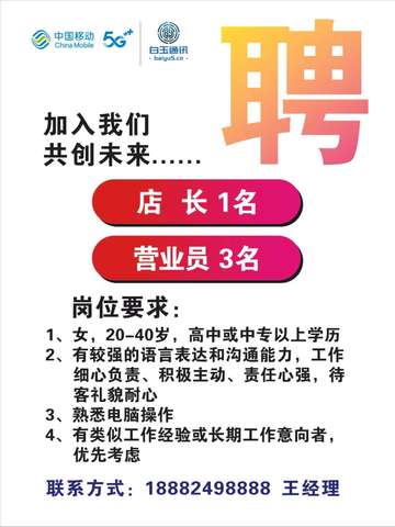 招聘 移动营业厅前台营业员,直销人员,内账财务行政人员